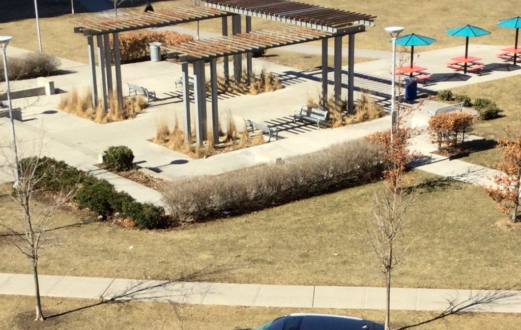 In the beginning it was winter. But then the snow melted and the weather started to go from winter to spring. We had a very cold and rainy mother’s day on my brother’s driveway. About a week after that I planned a picnic for my parents and I at the park across the street. I brought a huge bag filled with pre packaged snacks, place mats, Lysol spray and wipes. My parents picked up subs. We had just finished our lunch and a Vaughan city worker came and told us the park was closed and we had to leave. My dad’s 75th birthday was in June. We had a visit with family in my brother’s backyard and then we had planned for a few of his friends to meet in the park. There were a lot of people in the park that day. Along came a Vaughan city worker and told us we are not allowed to congregate in the park. We had to move along. So we did. This photo was taken from my balcony. A balcony that does not get ANY sun. It was very hard in those early days not even having a place to sit out side and enjoy the sun.